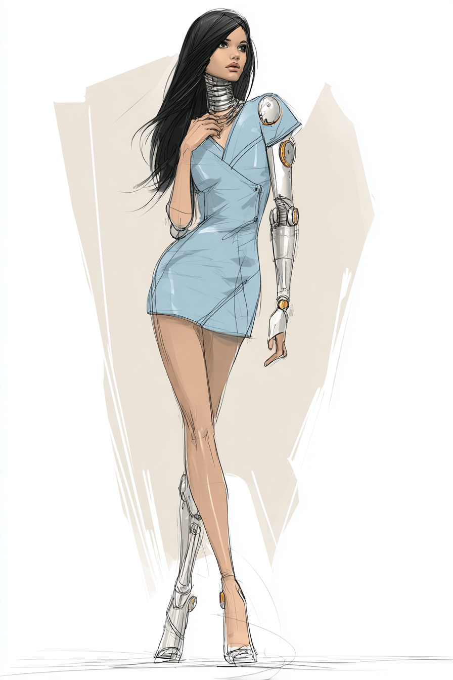 Reframed couture sketch methodology through controlled generative direction and digital finishing.